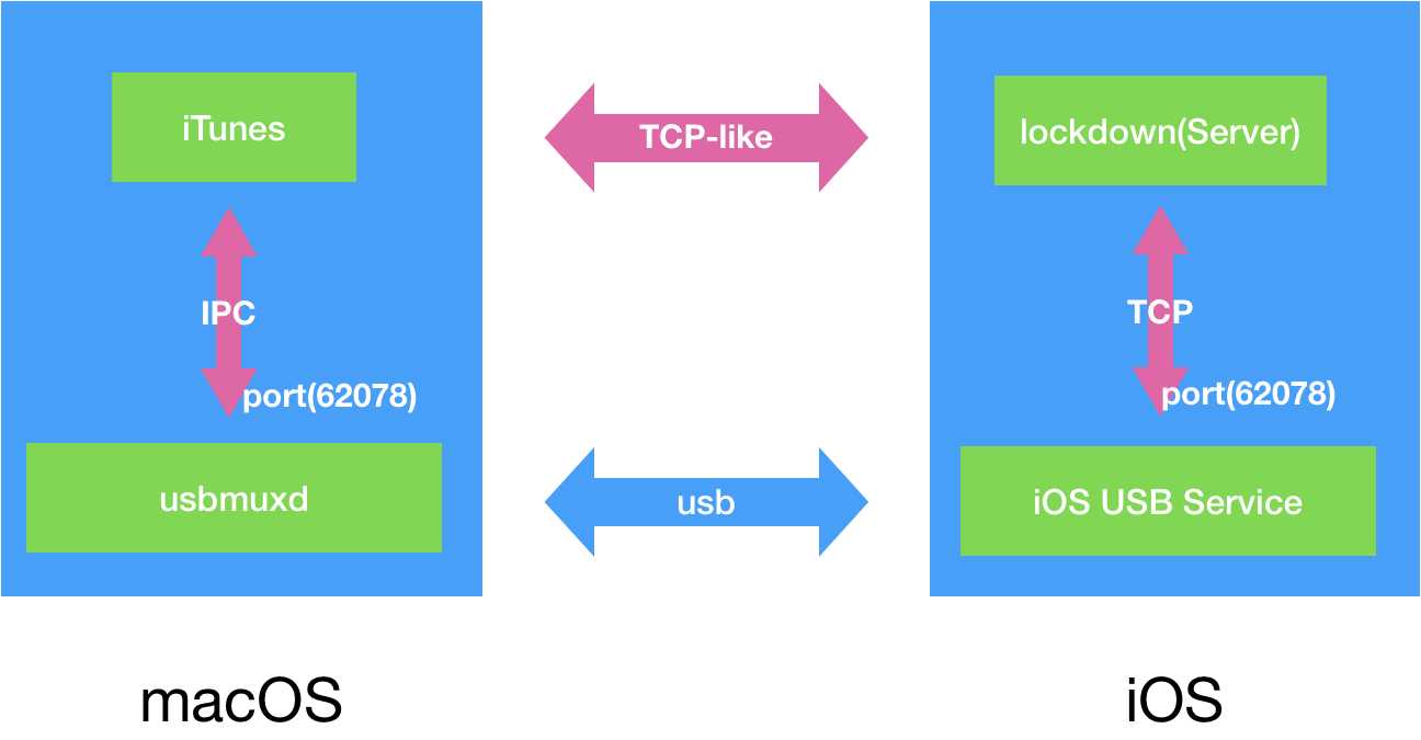 iOS 和 Mac 之间进行 USB 通信,采用的是 USB 协议称之为 usbmux ,其本身是私有协议,用于自身应用使用,但是都被破解得差不多了...