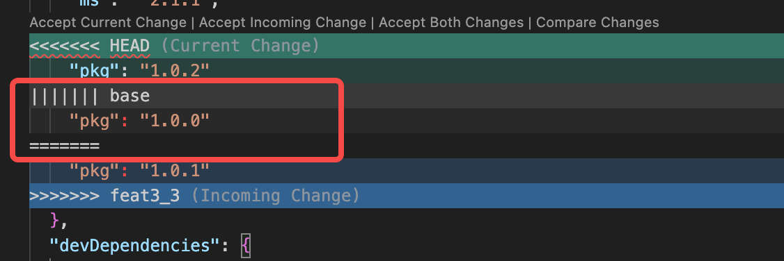 红框区域(||||||| 至 =======)表示的就是改动前的上下文,确切的说,是 当前分支 和 目标合并分支 的最近公共祖先节点在该区域的内容。