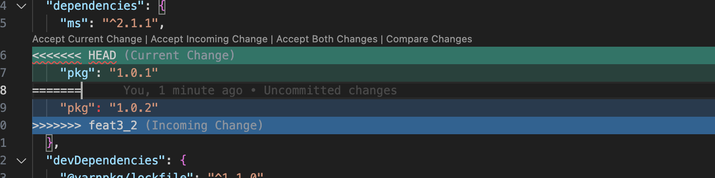 实际上这个例子,是第二种情况,两个分支都对 pkg 的版本做了改变。