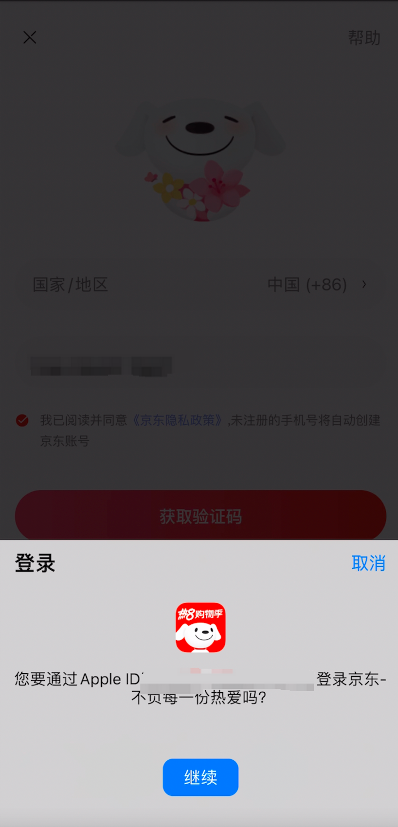 而实际上正经的苹果一键登录不长这样,以京东为例: