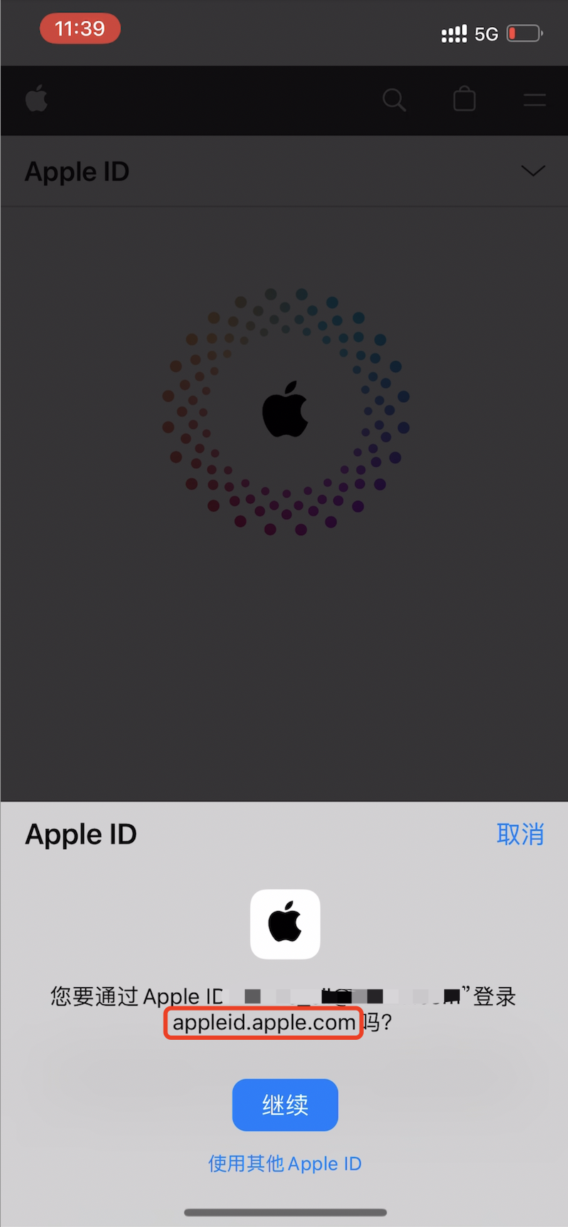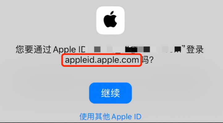 - 观察苹果一键登录界面,如果弹窗样式和以下一样,又出现「appleid.apple.com」红框文案,必为诈骗