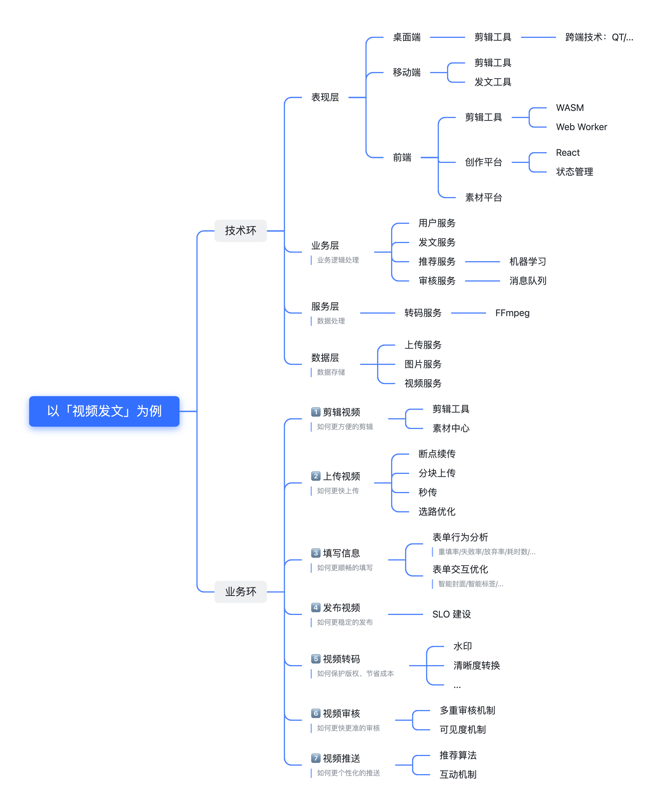 以「视频发文」业务为例,我们可以简单画出这样的技术环和业务环。