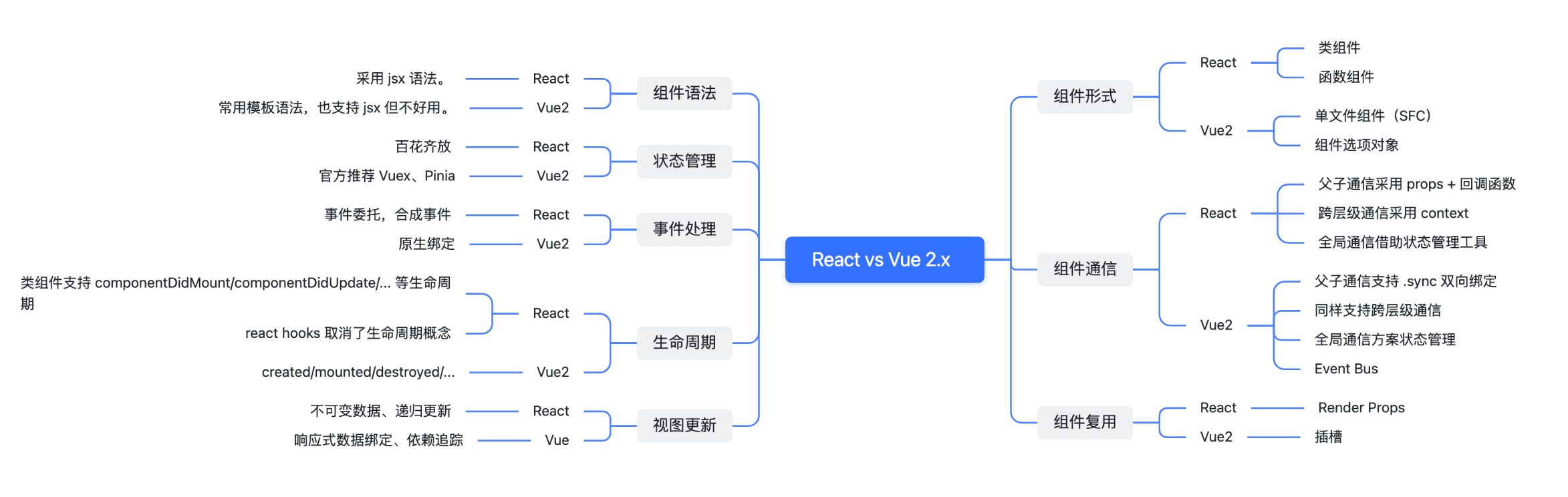 - 如果想要横向学习同领域的不同技术,比如熟悉 Vue 的情况下学习 React,可以采用比较学习法,整理关键技术点,按点学习对比差异。