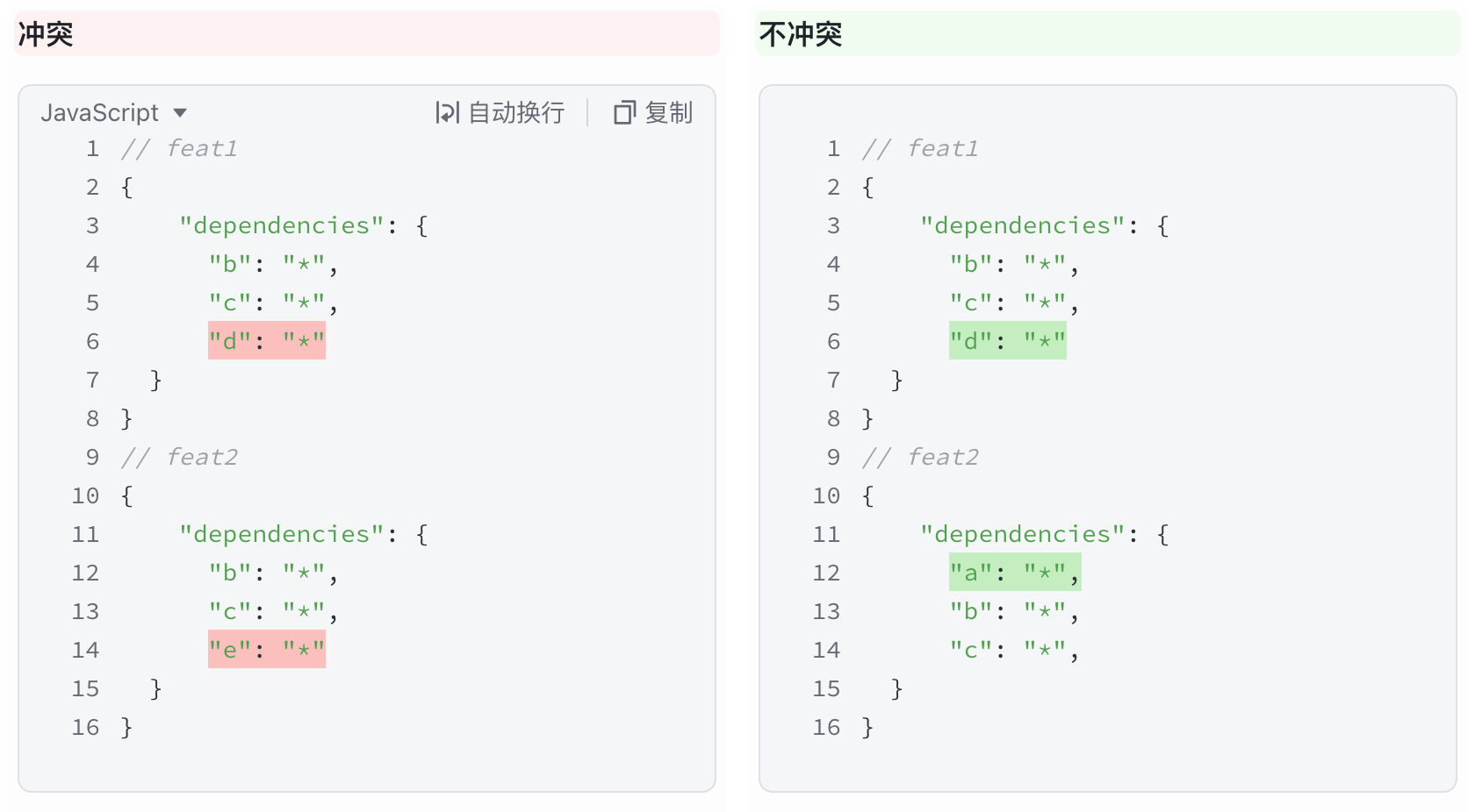 注意合并冲突的关键:同一区域发生变化。以 package.json 的依赖配置为例,下面这两个例子,第一个会冲突而第二个不会冲突。